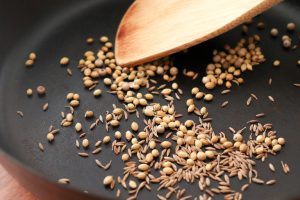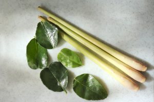 まずはコリアンダーシードやクミンシードなど粒のスパイスをフライパンで炒って香り出し。ニンニクや生姜は一口大に切り、赤唐辛子は種を取り出し水に浸けてふやかしておく。そしてなんといってもタイカレーに欠かせないのがコブみかんの葉と生のレモングラス。この二つがあの独特な清涼感のある香りの元となる。