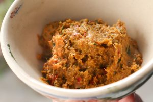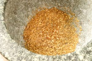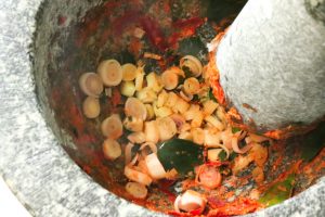 炒ったスパイスをまずはクロックヒンですり潰し粉末状に。その後は繊維質で硬いものから入れていきどんどんすり潰していく。使ってみてすぐに納得した、クロックの重さの理由。同じく石でできた棒(サーク)で叩いていくと、力を入れていないのにいとも簡単に潰れていく。繊維質のレモングラスもあっという間。すり潰す度にハーブやスパイスの爽やかで深みのある香りが漂ってくる。コク出しにアミの塩辛を入れてあっという間に完成!